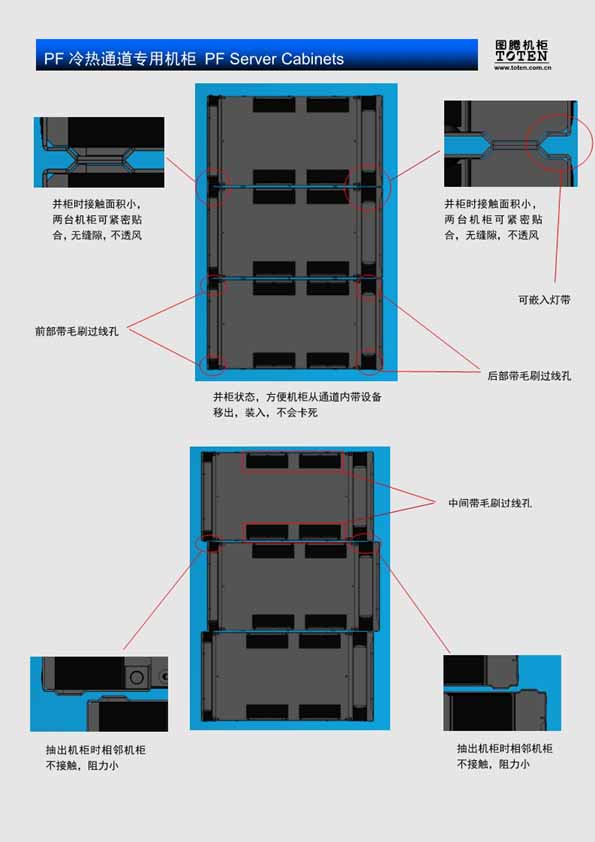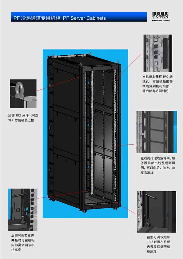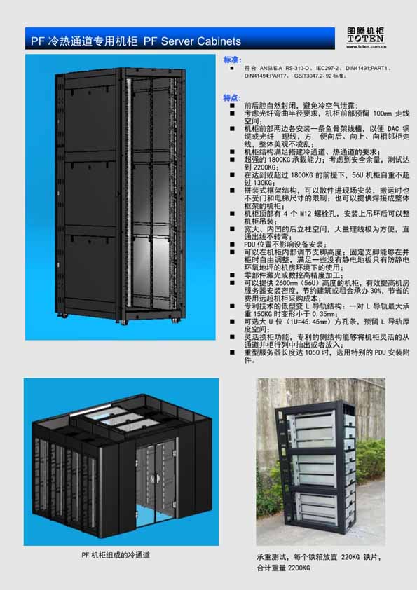 PF机柜是应用于数据中心冷热通道、微模块单元的图腾创新机柜,具备如下显著特点: 1、前后腔严密封闭,避免冷空气泄漏,节省能源,降低机房PUE水平 2、所有走线口安装有可按走线量撕开的走线孔盖,避免了毛刷孔盖的漏风、翘曲、易燃问题,安全节能; 3、超强的2000KG动态承载能力以及2000KG静态承载能力; 4、满足650Kg抗8级9级烈度抗震测试要求; 5、宽大、内凹的后立柱PDU及线缆安装空间,线缆上出口直通不用转弯,不影响服务器安装; 6、预留柜顶中部、柜底中部两侧走线口; 7、机柜前立柱带理线槽,理顺前部线缆向上、向后、向左右导出,上出线不需要转弯,不影响服务器安装; 8、可拆卸侧门,侧门内部锁定; 9、可按需制成拼装式结构:安装时不受门和电梯尺寸的限制; 也可以焊接成一体; 10、机柜内部调节支脚高度; 11、可以整机柜吊装; 12、低变形L导轨结构; 13、前方孔条100、150空间灵活安装; 14、汽车等级的阴极电泳底涂,高温盐雾耐蚀达400小时以上; 15、符合RoHS无毒环保标准; 16、零部件激光数控高精加工。