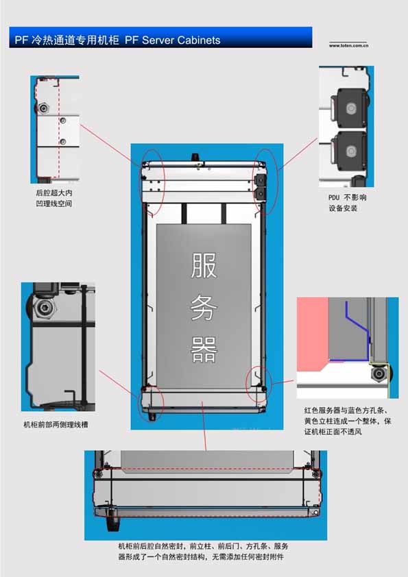 PF机柜是应用于数据中心冷热通道、微模块单元的图腾创新机柜,具备如下显著特点: 1、前后腔严密封闭,避免冷空气泄漏,节省能源,降低机房PUE水平 2、所有走线口安装有可按走线量撕开的走线孔盖,避免了毛刷孔盖的漏风、翘曲、易燃问题,安全节能; 3、超强的2000KG动态承载能力以及2000KG静态承载能力; 4、满足650Kg抗8级9级烈度抗震测试要求; 5、宽大、内凹的后立柱PDU及线缆安装空间,线缆上出口直通不用转弯,不影响服务器安装; 6、预留柜顶中部、柜底中部两侧走线口; 7、机柜前立柱带理线槽,理顺前部线缆向上、向后、向左右导出,上出线不需要转弯,不影响服务器安装; 8、可拆卸侧门,侧门内部锁定; 9、可按需制成拼装式结构:安装时不受门和电梯尺寸的限制; 也可以焊接成一体; 10、机柜内部调节支脚高度; 11、可以整机柜吊装; 12、低变形L导轨结构; 13、前方孔条100、150空间灵活安装; 14、汽车等级的阴极电泳底涂,高温盐雾耐蚀达400小时以上; 15、符合RoHS无毒环保标准; 16、零部件激光数控高精加工。